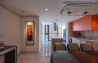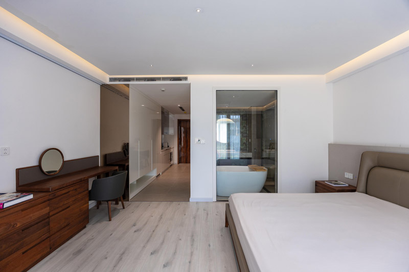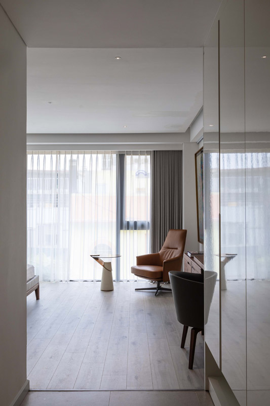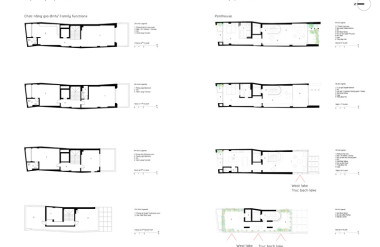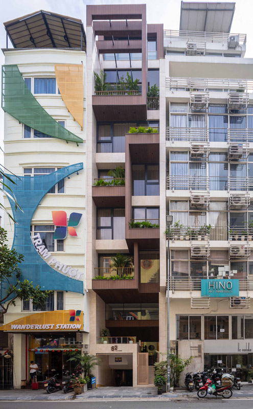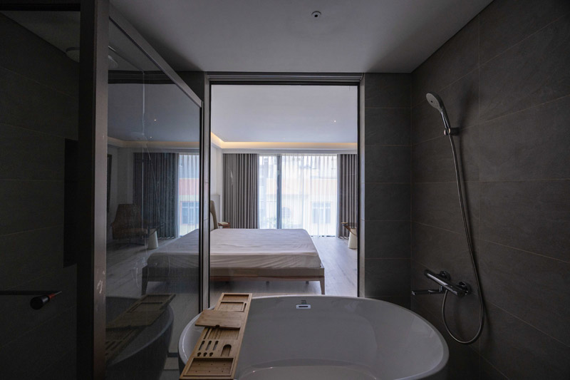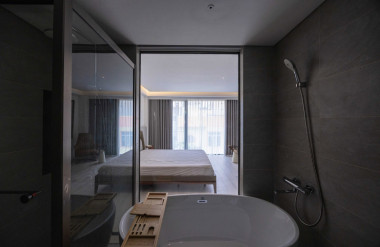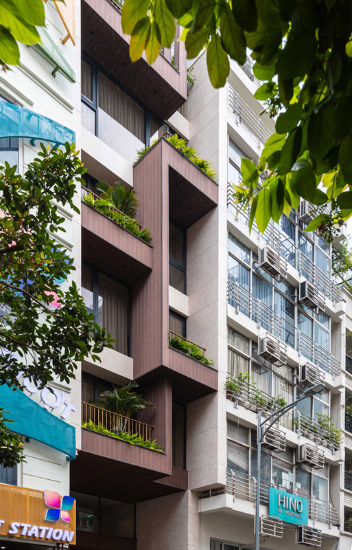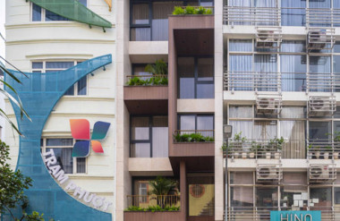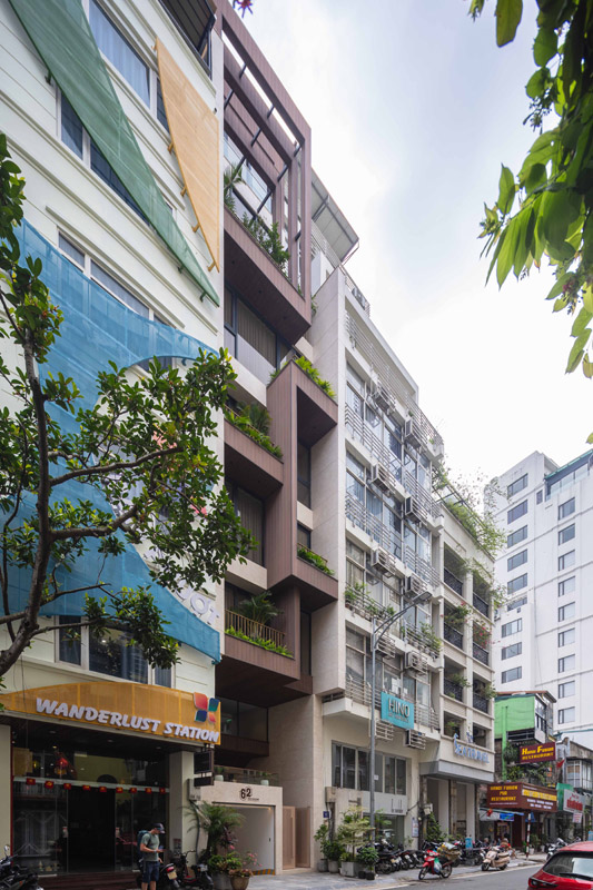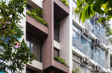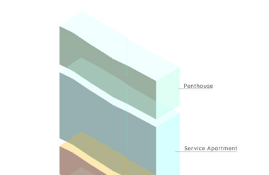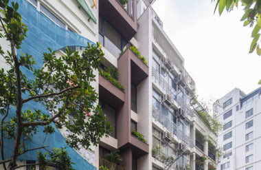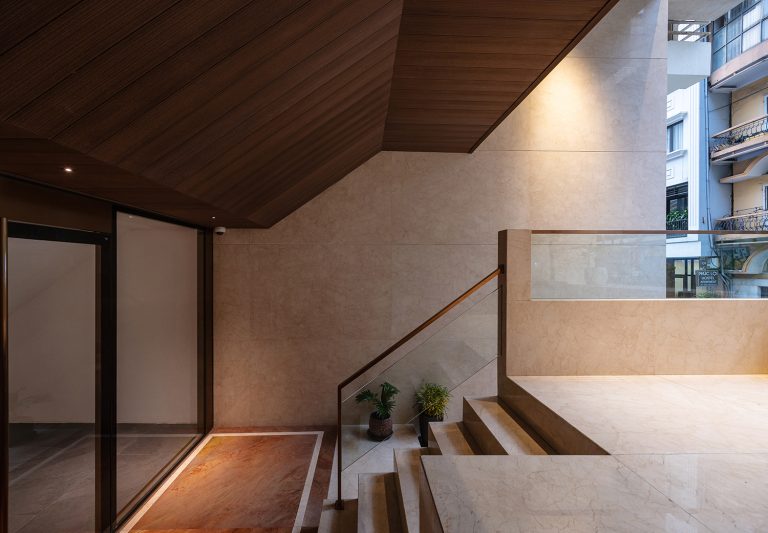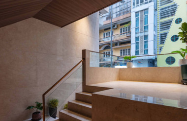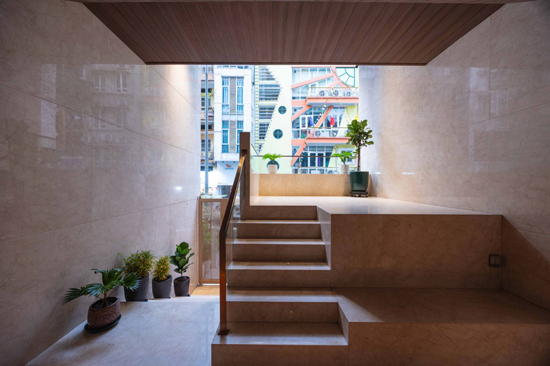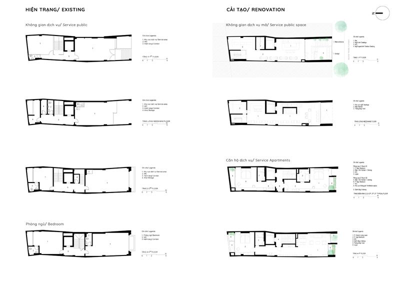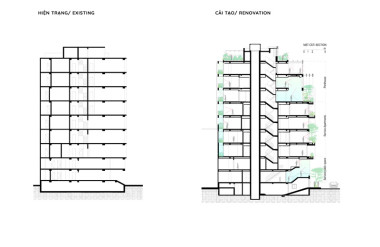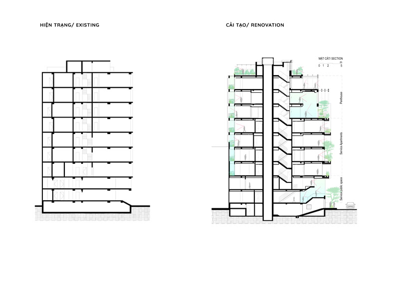 - Tầng 2–5: chức năng căn hộ dịch vụ cao cấp. Giải pháp then chốt trong tổ chức không gian tầng này là việc “quay dọc thang bộ” thay vì bố trí nằm ngang như hiện trạng cũ, cầu thang mới được sắp xếp chạy dọc theo chiều dài ngôi nhà. Sự thay đổi tưởng chừng nhỏ này lại mang ý nghĩa quyết định:
