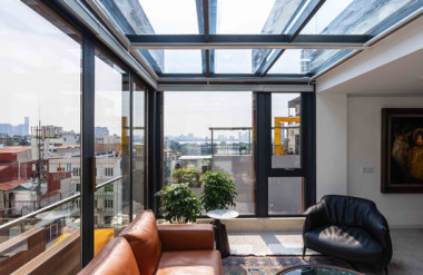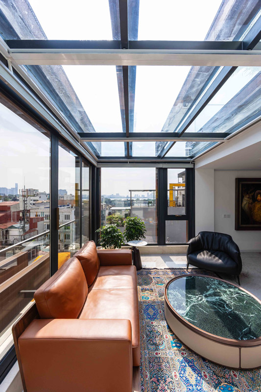 Tầng 6–9: dành riêng cho không gian penthouse gia đình, nơi tận dụng tối đa lợi thế tầm cao để mở rộng tầm nhìn ra toàn cảnh Hồ Tây và hồ Trúc Bạch. Hệ cửa kính lớn cùng các lớp vách di động giúp kết nối không gian nội ngoại thất mượt mà, cho phép luồng gió Đông Nam mát lành len lỏi vào nhà, đảm bảo không gian khô thoáng và dễ chịu quanh năm.