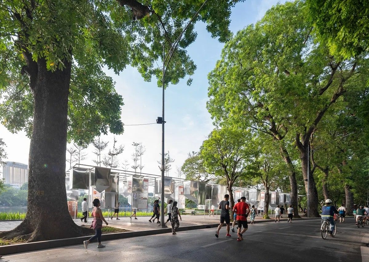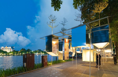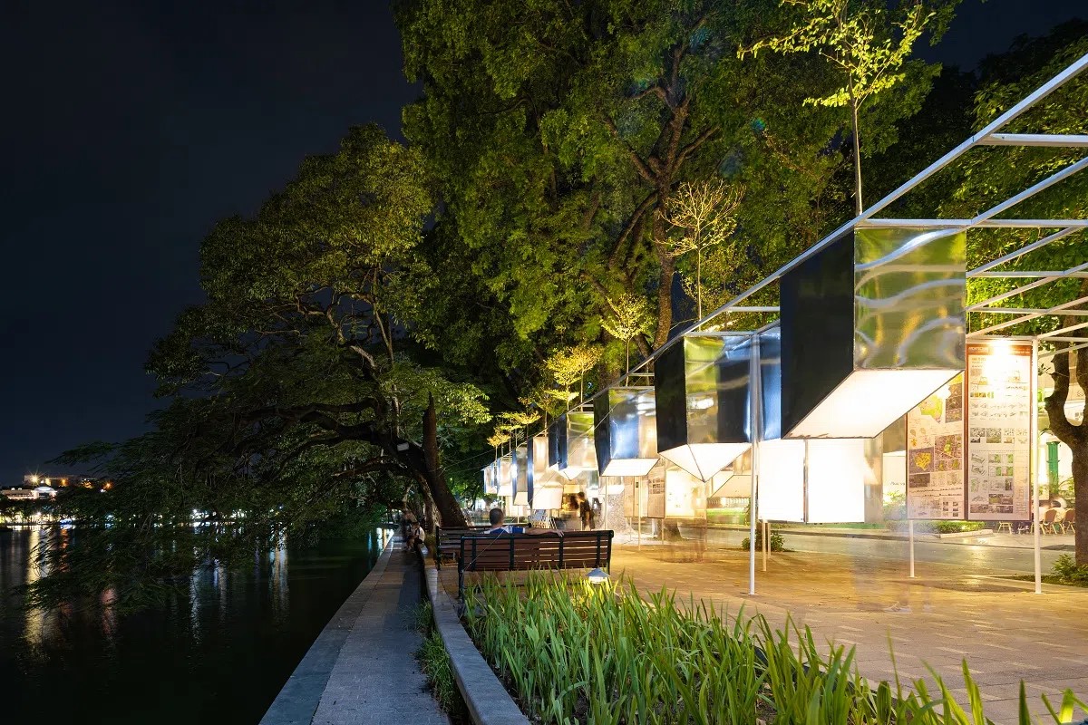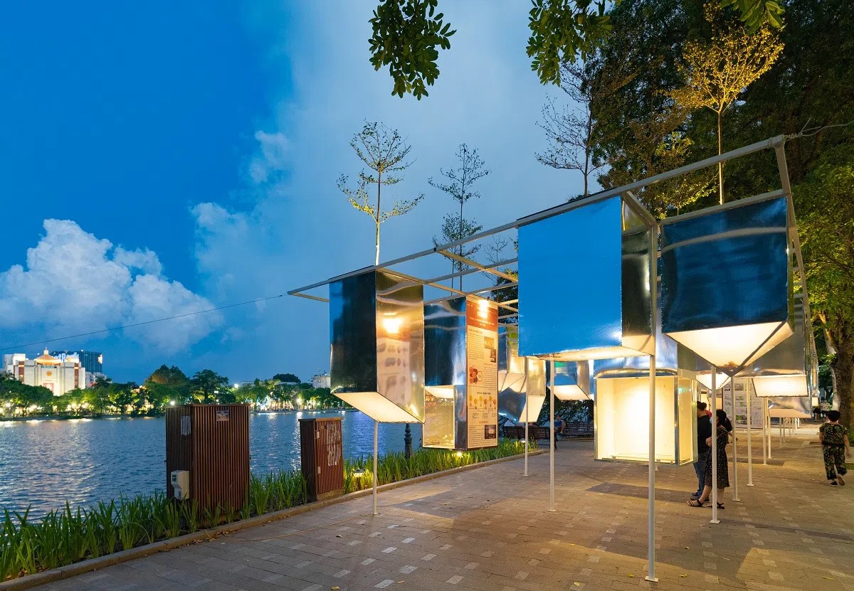 ALP Pavilion “Giấc mơ đô thị” được cấu tạo từ những khối hộp so le và bất đối xứng. Nhìn từ xa, những khối hộp so le đặt cạnh nhau này tạo liên tưởng tới hình ảnh thành phố Hà Nội được phản chiếu qua mặt hồ Hoàn Kiếm, khơi gợi sự tò mò và thu hút sự chuyển động của dòng người len lỏi qua “mê cung” để khám phá.