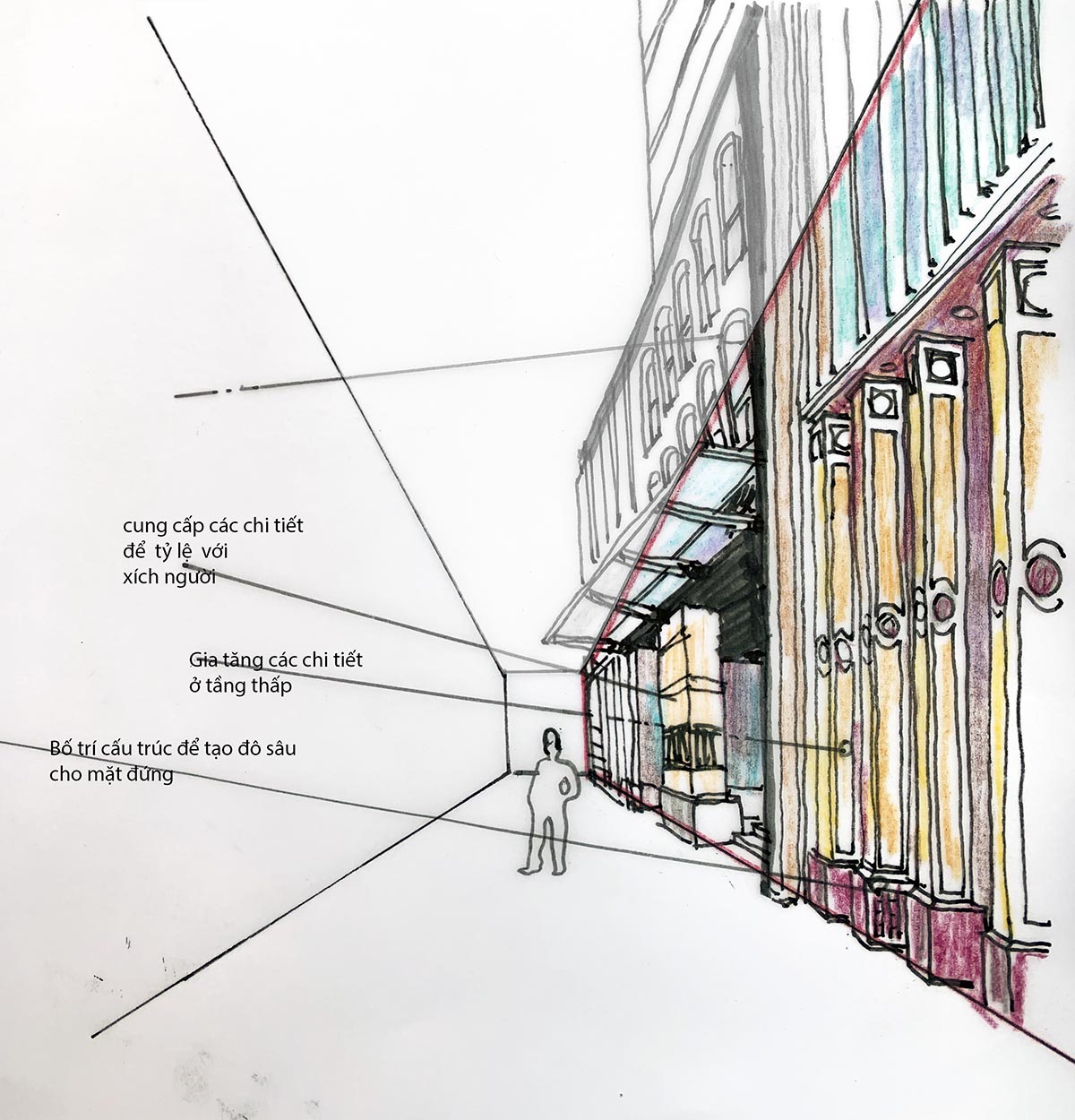 - Góc nhìn đường phố: Tạo không gian quan trọng trải nghiệm của người đi bộ. Sẽ cần sự hòa hợp hay tương phản của công trình với các thành phần trong góc nhìn này để tạo một bức tranh hoàn chỉnh.