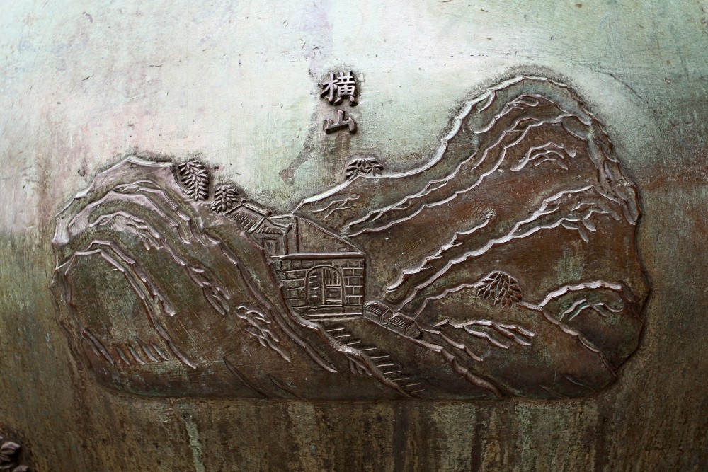 Tổng cộng có 153 hình ảnh đậm tính dân tộc, tính dân gian cùng tên gọi được khắc trên 9 đỉnh. Các hình khắc trên đỉnh được chia làm 3 tầng, mỗi tầng 6 hình xen kẽ với mảng trống; xếp trên dưới so le với nhau. Các hình này được phân thành các nhóm, mỗi nhóm có 9 hình khắc trên 9 đỉnh như: Tinh tú, núi sông, cửa biển, lãnh hải, cửa ải, hoa cỏ, động vật, binh khí, xe thuyền…