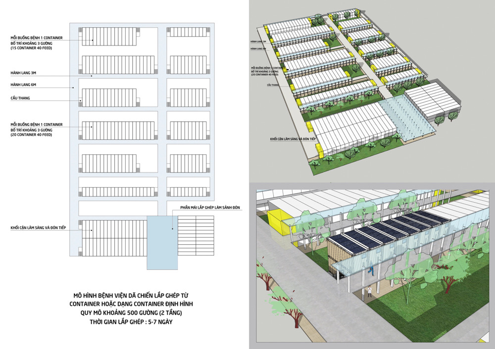 - Thứ hai là tạo nên cơ sở hạ tầng và công trình từ các block, bộ phận “tiền chế” đã được tính toán sẵn về ráp nối kỹ thuật và yêu cầu y tế, nhất là hệ thống khí cơ học và áp suất âm cần thiết cho việc ngăn chặn virus, vi khuẩn…cách này sẽ giải quyết được triệt để các nguyên tắc. Tuy nhiên, nếu không tính toán đầy đủ sẽ bị bất cập bởi các yếu tố: Không có giá trị sử dụng lâu dài, chuyển đổi mục đích hay tháo dỡ niêm cất tái sử dụng; tính an toàn bền vững và giá thành xây dựng cũng bị đe dọa; khi hệ thống xử lý nước thải không đảm bảo có thể biến thành ổ dịch, ảnh hưởng đến khu vực cư dân lân cận.