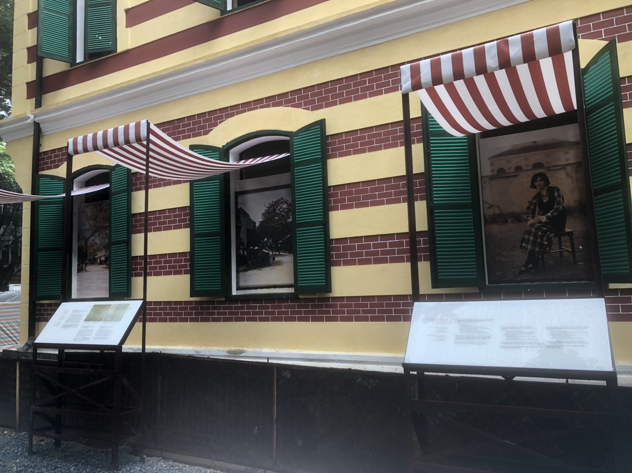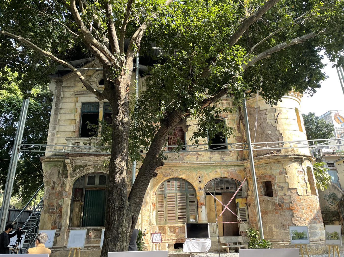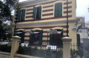 Ông Emmanuel Cerise: Trước hết, tôi phải khẳng định trong dự án này, chúng tôi không tìm được tư liệu bản vẽ gốc của tòa nhà và điều này là hoàn toàn dễ hiểu bởi vì đây không phải công trình kiến trúc chủ đạo của chính quyền, của công chức mà đây chỉ là biệt thự tư nhân, và với biệt thự tư nhân, người ta không có nghĩa vụ phải lưu lại hồ sơ thi công, nhất là giai đoạn cuối thế kỉ 19 đầu thế kỉ 20. Có thể nói rằng tài liệu còn lại duy nhất chính là bức ảnh chúng tôi đã từng công bố, bức ảnh của gia đình gia chủ chụp ở cổng số 40 Hàng Bài. Thế nhưng chúng ta cũng biết đấy là bức ảnh đen trắng và nếu như mà chúng ta còn lưu lại được những tài liệu bản vẽ thì nó cũng là bản vẽ đen trắng, không có tài liệu nào thể hiện rằng ngày đấy người ta dùng màu sơn như thế nào. Tuy nhiên, chúng tôi chỉ có 2 cơ sở để tìm ra màu như chúng tôi đang thử nghiệm. Đó là trong quá trình nghiên cứu hiện trạng công trình, chúng tôi đã thám sát các lớp vữa phủ bên ngoài tường. Khi róc lần lượt các lớp vữa đã được phủ lên rất nhiều lớp khác nhau theo thời gian thì tìm được lớp vữa gốc là nó có cái màu đỏ. Tức là ngày xưa, khi mà công trình mới được xây dựng có 2 màu: màu ve vàng và ve đỏ giả màu gạch và có kẻ cách đường chỉ ve giả. Chúng tôi dựa vào đó để lựa chọn màu sắc. Cái thứ hai, mặc dù những ảnh cổ Hà Nội đầu thế kỷ 20 hầu hết là ảnh đen trắng nhưng có một lô ảnh của nhà nhiếp ảnh Leon Busy chụp năm 1915 thì có rất nhiều công trình thời kỳ đó được chụp bằng hình màu, tất nhiên kỹ thuật màu không phải phim màu như bây giờ nhưng nó vẫn thể hiện được rằng rất nhiều công trình được xây dựng theo kiểu đó: Có các lớp đan xen giữa tường vàng và tường đỏ như thế nhưng tone màu không thể hiện được thực chất khi chúng ta nhìn bằng mắt thường. Chính vì thế chúng tôi đang trong quá trình thử nghiệm và sẽ có những hoàn thiện dần.