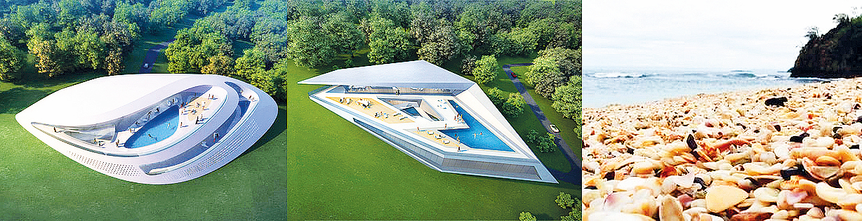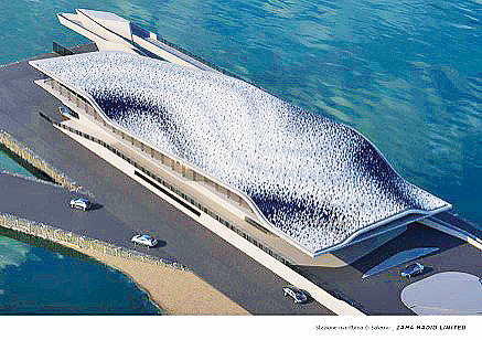 Những sinh vật đại dương cũng được mô phỏng nhiều trong thiết kế những công trình gần biển của Zaha. Nếu thiết kế khu trung tâm bờ biển Regium Waterfront (Hình 12) ở Reggio, Calabria, Italy lấy cảm hứng từ con sao biển, thì Cảng biển Salarno – cũng ở Italy – lại được thiết kế theo dạng vỏ hàu (hình 13), hay như Dự án resort cao cấp ở đảo Munandhua, Maldives lại mang dáng dấp của một chú cá lớn (hình 14). Phần lớn các công trình hình thái hữu cơ của Zaha thường bao phủ bởi những mặt cong nhưng đôi lúc lại rất sắc cạnh và gai góc như thiết kế quần thể Biệt thự nghỉ dưỡng ở resort Dubrovnik, (Croatia) khi bà muốn miêu tả hình ảnh sỏi đá và vỏ sò đặc trưng tại bờ biển này (hình 15)