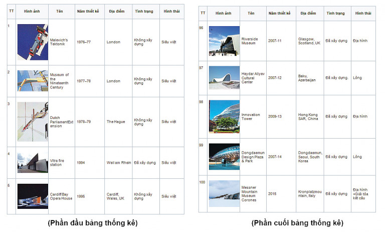 Trong suốt cuộc đời hành nghề của mình, từ lúc tốt nghiệp trường kiến trúc London năm 1976 cho đến khi qua đời đột ngột năm 2016, Zaha đã thiết kế hơn 200 công trình, từ những dự định dang dở còn đang phác thảo trên giấy, đến những dự án đang được xây dựng và đã hoàn thành. Tác giả đã thống kê khoảng 100 công trình tiêu biểu nhất của Zaha Hadid và phân loại hình thái theo bảng tổng hợp bên dưới, vì số lượng lớn nên hình ảnh chỉ cho thấy một phần của bảng: