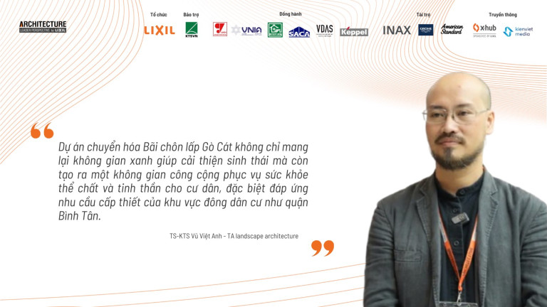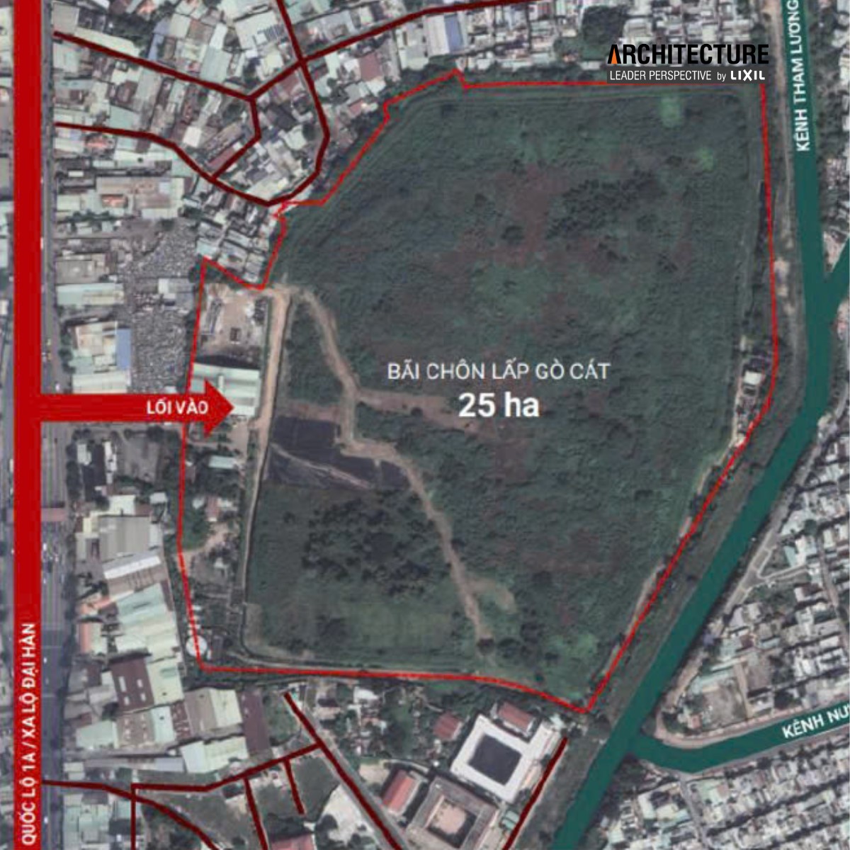 Bãi chôn lấp Gò Cát (25ha) tại phường Bình Hưng Hòa, quận Bình Tân là một trong những khu xử lý chất thải rắn lớn của thành phố Hồ Chí Minh. Sau nhiều năm chôn lấp rác, nơi đây đã hình thành một quả đồi, có diện tích lớn gấp 3 lần cây xanh hiện hữu trên địa bàn quận, trong khi hiện trạng thiếu không gian xanh công cộng khiến người dân phải di chuyển xa để tìm kiếm không gian vui chơi, thể dục thể thao. Trải qua thời gian đến nay là hơn 16 năm kể từ khi đóng cửa bãi chôn lấp, tổng thể khu vực này đang tồn tại tiềm năng rất lớn của một không gian xanh phục vụ cộng đồng dân cư theo đúng quy hoạch được duyệt là trở thành khu vực công viên đô thị. Để biến nội dung đã được quy hoạch công viên xanh này thành hiện thực, TA Landscape Architecture đề xuất khung giải pháp kiến trúc cảnh quan tích hợp thiết kế định hướng thực thi, vừa phù hợp với tính chất hạ tầng và môi trường phức tạp của một bãi chôn lấp, vừa tính đến hành động theo diễn trình để tuần tự hình thành nên những lớp không gian có chức năng phục vụ cộng đồng thích hợp và thích ứng với tính chất sinh thái, xã hội của địa bàn.