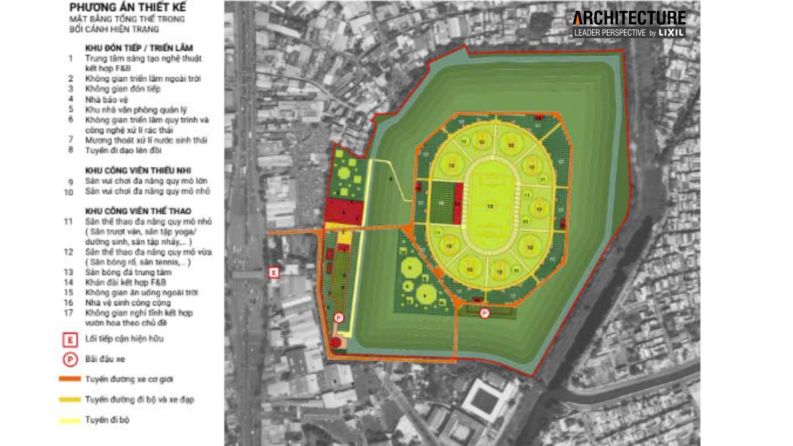 - Vùng lõi: Tổ hợp các sân thể thao đa mục đích trên đỉnh bãi chôn lấp, kết hợp không gian vườn hoa, picnic và các khu vực công cộng khác.