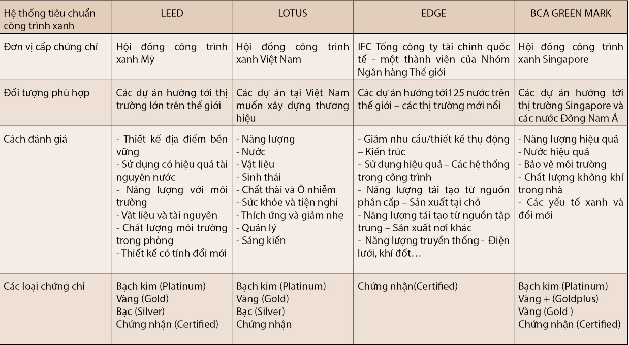 Hiện nay, tại Việt Nam đang áp dụng chủ yếu 4 loại tiêu chuẩn công trình xanh (công trình công nghiệp xanh cũng áp dụng theo các tiêu chuẩn này), bao gồm LEED (Hội đồng công trình xanh Mỹ), LOTUS (Hội đồng công trình xanh Việt Nam), EDGE (IFC Tổng công ty tài chính quốc tế – một thành viên của Nhóm Ngân hàng Thế giới), BCA – GREEN MARK (Hội đồng công trình xanh Singapore).