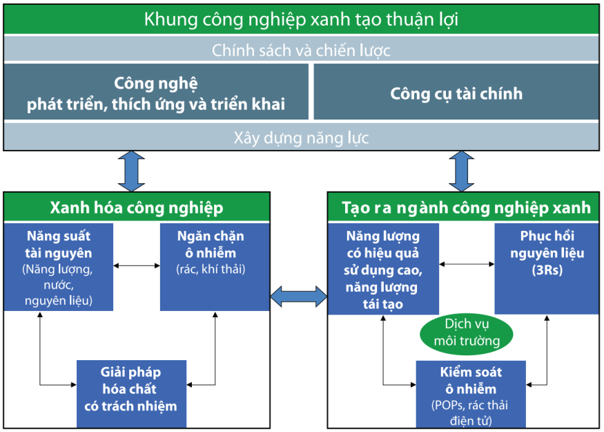 Theo Tổ chức phát triển công nghiệp Liên hợp quốc, Công nghiệp Xanh là một chiến lược hoạt động mà các ngành công nghiệp tại các quốc gia ở tất cả các giai đoạn phát triển có thể sử dụng để đạt được phát triển bền vững bằng cách tách tăng trưởng kinh tế ra khỏi việc sử dụng quá mức tài nguyên và gây ô nhiễm môi trường, giảm thiểu lượng phát thải, sử dụng năng lượng một cách hiệu quả, và triển khai sử dụng các nguồn tài nguyên có thể tái tạo làm nguyên liệu cũng như năng lượng đầu vào. Việt Nam đã từng bước gia nhập, tham gia vào chiến lược hoạt động của công nghiệp xanh, trong bối cảnh là nước đang phát triển phấn đấu đạt tới phát triển bền vững bất chấp dân số đông, áp lực về môi trường và biến đổi khí hậu. [2]