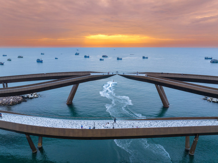 Đóng vai trò của một cây cầu đi bộ trên biển, nhưng hai nhánh cầu lại không chạm nhau để nối liền mà cách xa nhau ở khoảng cách 30cm và 2 người đứng ở 2 bên sẽ cách nhau khoảng 45 cm. Khoảng cách ấy vừa vặn cho một cái ôm, cái bắt tay hay sẽ được “lấp đầy” bởi những nụ hôn trong ánh hoàng hôn tuyệt đẹp khi chiều buông trên biển, tạo nên một khung cảnh lung linh và vô cùng lãng mạn.