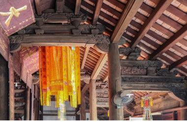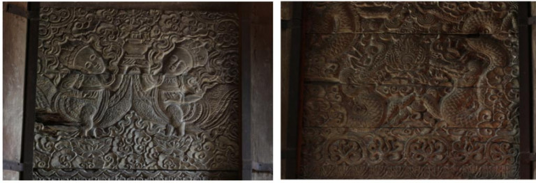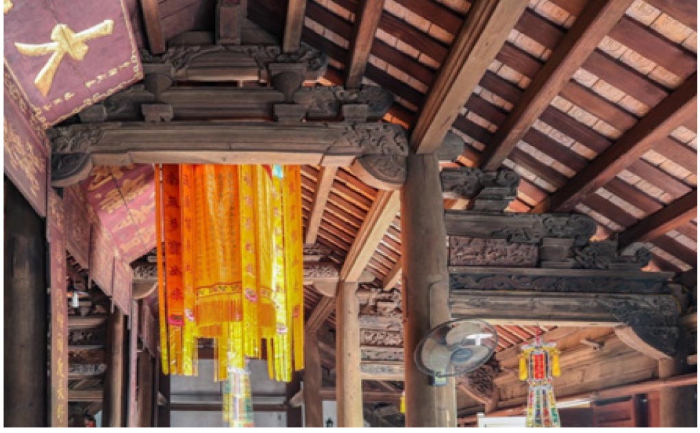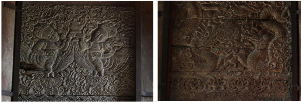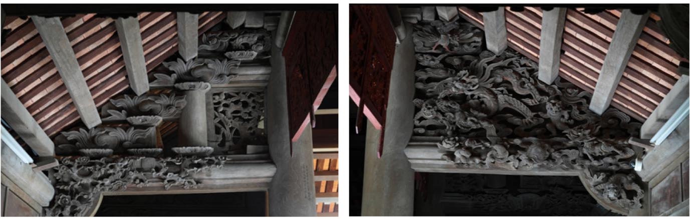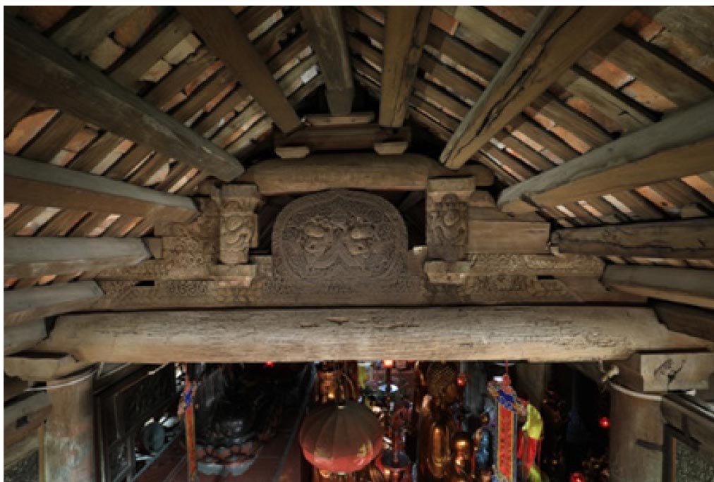 Để giảm sự thô cứng, các cấu kiện gỗ đỡ mái thường được nghệ nhân chạm khắc, trang trí những họa tiết hoa văn đặc sắc và mang dấu ấn đương thời. Những chạm khắc trang trí có giá trị nhất phải kể đến như ở ván lá đề trên Thượng điện chùa Dâu (Bắc Ninh), chùa Thái Lạc (Hưng Yên) với các hoa văn rồng, phượng, tiên nữ, phỗng mang phong cách nghệ thuật thời Trần (thế kỷ 14), có thể coi như những tác phẩm điêu khắc gỗ cổ nhất hiện còn trên kiến trúc ngôi chùa Việt.