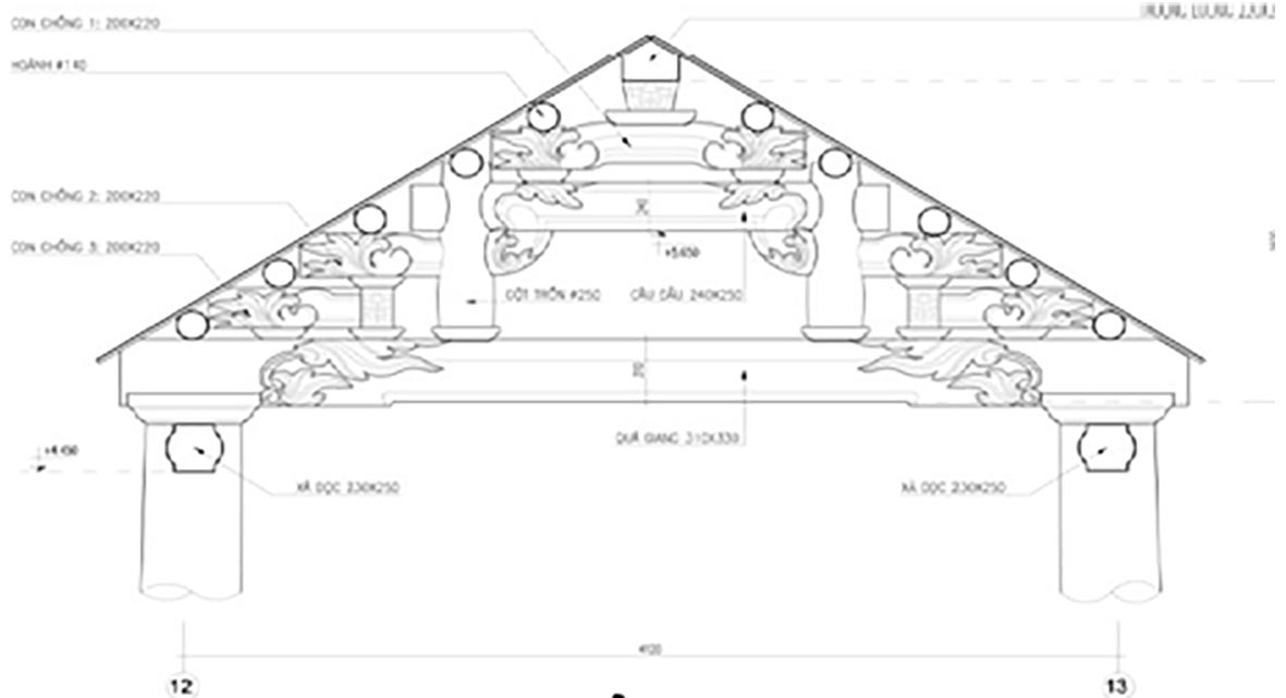 - Kiểu vì nóc thứ hai là kiểu chồng rường, gồm những con rường chồng lên nhau qua các đấu vuông thót đáy (chùa Keo – Thái Bình) hoặc qua các đấu sen (chùa Tây Phương – Hà Nội, hay Tiền đường chùa Thầy – Hà Nội)… Đó đều là những bộ vì nóc chồng rường niên đại từ thế kỷ 17, 18 còn bảo tồn đến ngày nay. Các con rường ngắn dần khi lên cao theo chiều dốc mái…;
