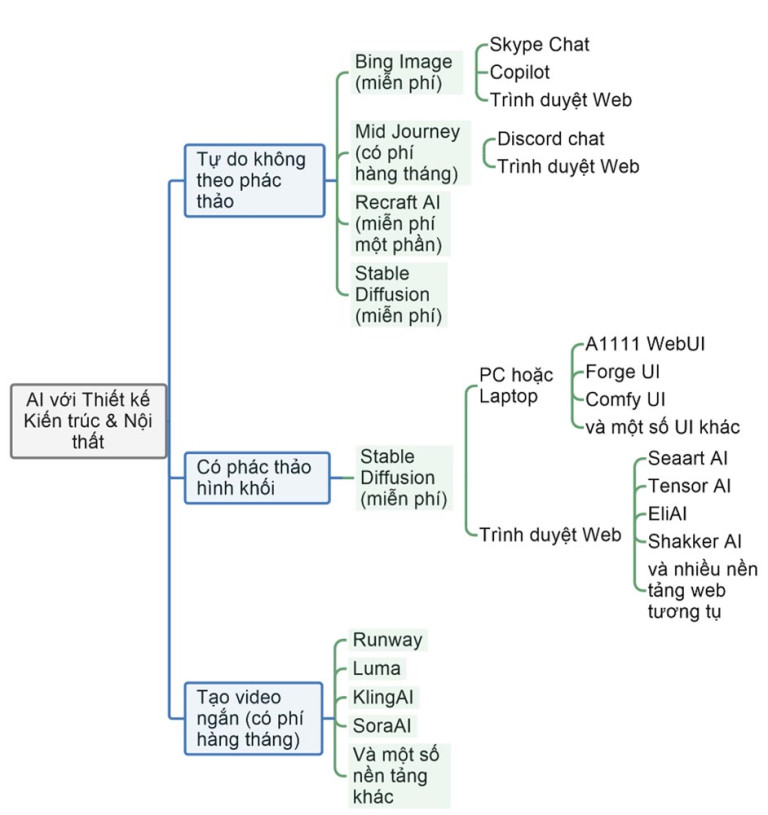 Theo quan sát của nhóm, tính đến thời điểm hiện nay, 4 nhóm mô hình AI có mức độ ảnh hưởng lớn nhất tới quy trình thiết kế ý tưởng kiến trúc và nội thất: