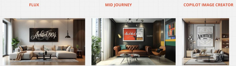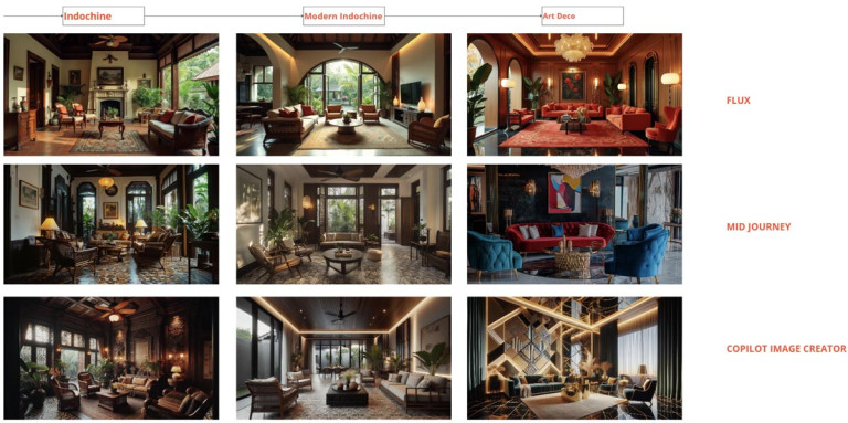 Trong nghiên cứu của nhóm, chúng tôi làm thí nghiệm số để so sánh chất lượng và tính đa dạng của 3 nền tảng AI thông dụng hiện nay trong sáng tạo kiến trúc – nội thất gồm: (1) Stable Diffusion với Checkpoint Flux Dev.1 (gọi tắt là Flux), (2) Midjourney, và (3) Copilot Image Creator (trước đây là Bing Image creator hay Dall-E 3). Mục đích của công việc này là so sánh tính hiệu quả của 3 nền tảng này trong việc nhận diện và tái hiện các phong cách thiết kế và các vật liệu thông dụng trong sáng tạo kiến trúc – nội thất; từ đó cung cấp căn cứ để KTS quyết định nên sử dụng nền tảng nào cho công việc của mình.
