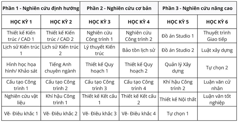CTKT gồm 2 học kỳ đại cương (chương trình của VGU) và 6 học kỳ chuyên ngành chương trình của HSA), cung cấp kiến thức thiết kế, nghệ thuật, khoa học, công nghệ, lý thuyết, và các kỹ năng mềm. Mỗi học kỳ chuyên ngành có một môn học thiết kế chính với nhiều thể loại công trình khác nhau, đóng vai trò là “xương sống” để phát triển kỹ năng thiết kế của sinh viên. Các môn học lịch sử, lý thuyết, kỹ thuật và công nghệ cung cấp kiến thức nền tảng cho môn thiết kế. Ngoài ra, các môn học tự chọn ở 2 học kỳ cuối cho phép sinh viên bổ sung kiến thức theo nhu cầu học của cá nhân, chuẩn bị cho đồ án tốt nghiệp. Cụ thể, chương trình chú trọng vào các nội dung sau đây: