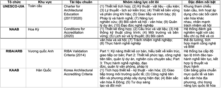 (1) Các khung chuẩn quốc tế chính thức (UNESCO-UIA, NAAB, RIBA, KAAB);