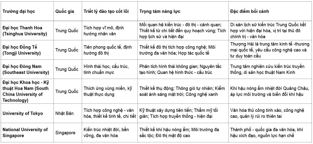 Triết lý này vừa tạo nền chung cho toàn hệ thống vừa mở đường để mỗi trường phát triển thế mạnh riêng. Ví dụ, các trường tại Hà Nội có thể tập trung vào di sản và bản sắc văn hóa Bắc Bộ; các trường tại TP. HCM có thể phát triển thế mạnh về kiến trúc đương đại và hội nhập quốc tế; các trường tại miền Trung và Nam Bộ có thể chuyên sâu về kiến trúc nhiệt đới và thích ứng biến đổi khí hậu. Cách tiếp cận này học tập từ mô hình thành công của Trung Quốc, nơi các cơ sở đào tạo KTS đều có bản sắc riêng rõ ràng trong khi vẫn đảm bảo chất lượng quốc tế.