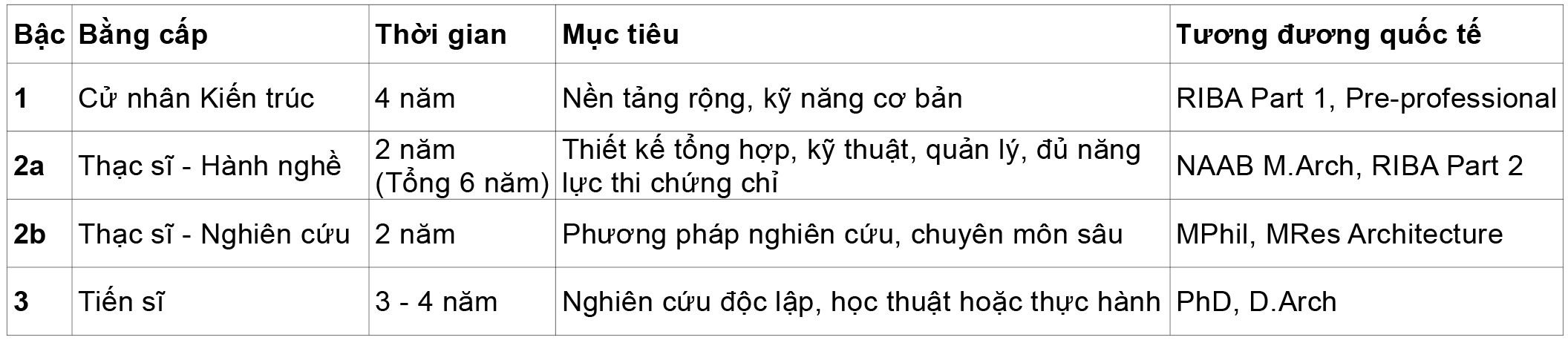 chương trình đào tạo; tại Anh, RIBA và ARB cùng tham gia quản lý chất lượng giáo dục và cấp phép hành nghề. Việt Nam cần tăng cường vai trò của Hội Kiến trúc sư Việt Nam (VAA) trong hệ sinh thái đào tạo và hành nghề.