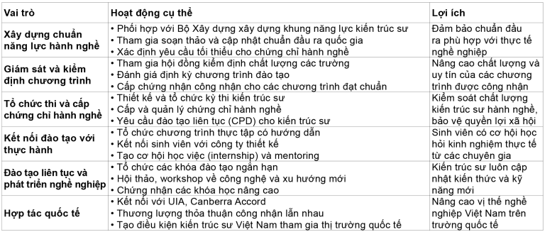 - Thúc đẩy sự công nhận quốc tế đối với bằng cấp kiến trúc Việt Nam.
