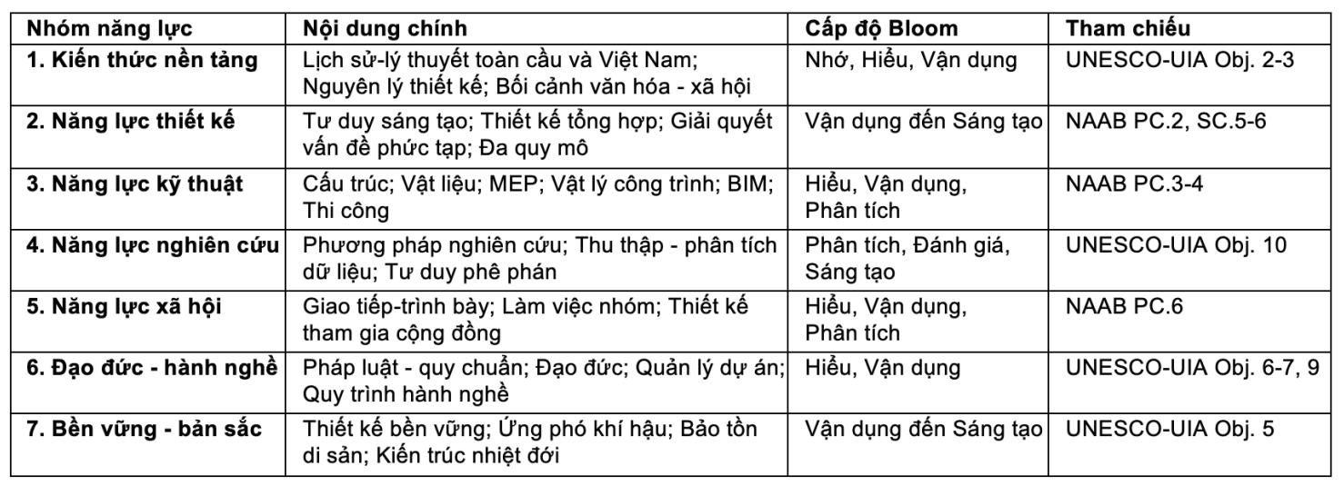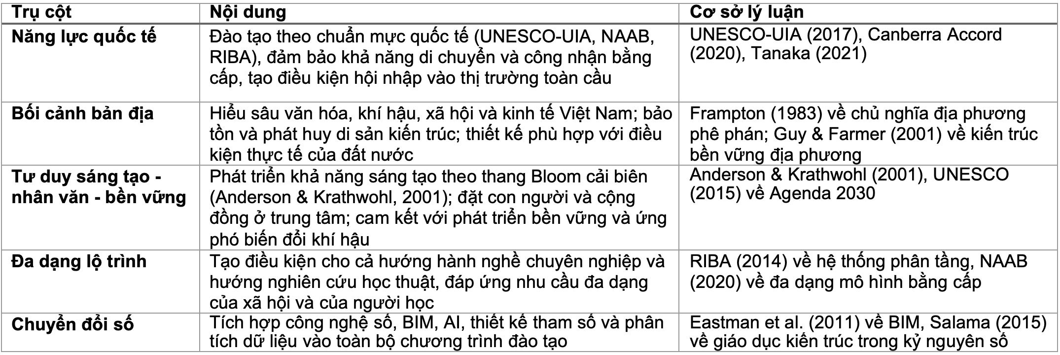 Triết lý đề xuất: “Đào tạo KTS Việt Nam có năng lực quốc tế, am hiểu bối cảnh bản địa, tư duy sáng tạo – nhân văn – bền vững, đáp ứng cả yêu cầu hành nghề và nghiên cứu trong bối cảnh chuyển đổi số và phát triển xã hội”. Triết lý này được xây dựng trên năm trụ cột chính, như được trình bày trong bảng sau: