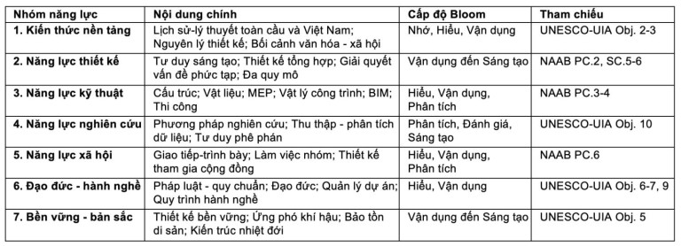 - Đào tạo dựa trên năng lực (Competency-Based Education – CBE) tiến thêm một bước khi không chỉ xác định chuẩn đầu ra mà còn tập trung vào việc phát triển các năng lực cụ thể mà người học cần có để thành công trong môi trường nghề nghiệp. Frank và cộng sự (2010) trong nghiên cứu về giáo dục y khoa đã nhấn mạnh rằng CBE yêu cầu sự tích hợp giữa kiến thức, kỹ năng và thái độ trong các tình huống thực tế. Áp dụng vào giáo dục kiến trúc, Nicol và Pilling (2000) trong nghiên cứu về chương trình đào tạo kiến trúc tại Anh đã chỉ ra rằng: Các năng lực cốt lõi của KTS bao gồm năng lực thiết kế tích hợp, năng lực kỹ thuật công trình, năng lực giao tiếp và trình bày, năng lực nghiên cứu và năng lực đạo đức nghề nghiệp. Mỗi năng lực này không tồn tại độc lập mà luôn được kết nối với nhau trong quá trình hành nghề.