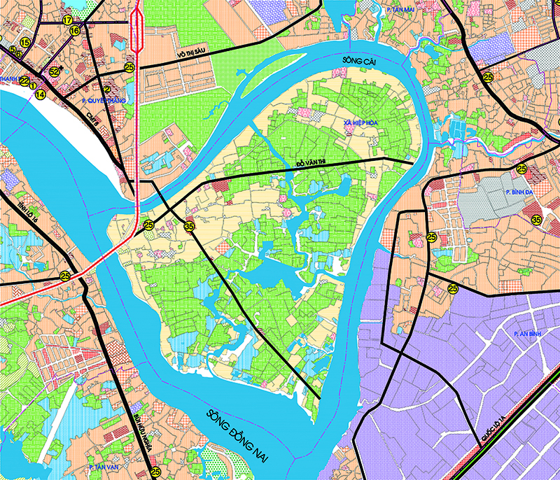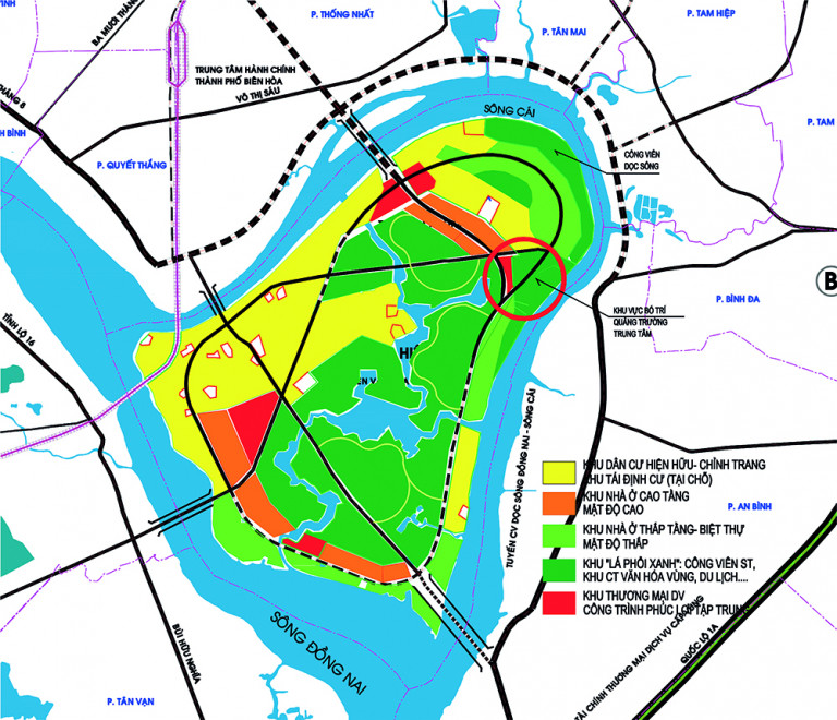 6. Khu nhà ở cao tầng, trục trung tâm: Trong định hướng kết nối giao thông với trục từ hướng trung tâm của TP Biên Hòa với Cù lao Phố phía Bắc trong hồ sơ QHC TP Biên Hòa, cần thiết xem xét dịch chuyển tuyến này một đoạn về phía Nam (khu vực đất trống, ruộng vườn – xem trên phương án đề xuất) để tránh ảnh hưởng các khu vực mang giá trị lâu đời cần bảo tồn tại khu dân cư ấp Nhị Hòa, nên có giải pháp bố trí xen kẽ các khu vực dân cư hiện trạng đông đúc với các khu định hướng phát triển kiến trúc cao tầng, đảm bảo sự cân bằng trong bảo tồn và phát triển.