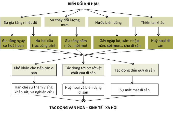 Với các di chỉ khảo cổ, biến đổi khí hậu làm thay đổi sự cân bằng của các quá trình thuỷ văn, hoá học và sinh học của đất nơi bảo quản chứng cứ khảo cổ, dẫn đến ảnh hưởng đến một số lớp khảo cổ, nguy hiểm hơn là có thể làm biến mất những lớp bằng chứng lịch sử của di chỉ. Công trình cổ là những đối tượng dễ bị tổn thương bởi biến đổi khí hậu hơn là những công trình hiện đại. Sự gần gũi với mặt đất làm tăng sự thấm và dẫn nước lên kết cấu công trình. Đất ẩm cũng góp phần gia tăng sự thẩm thấu và tích tụ muối trong khi các vật liệu xây dựng trong lịch sử mủn nhanh hơn vật liệu xây dựng hiện đại nào, bất kỳ sự tăng ẩm ướt nào của đất cũng có thể sẽ gây ra sự chuyển hóa muối mạnh hơn, các tinh thể muối sẽ làm hư hại dần các vật liệu trang trí bề mặt. Gỗ và các vật liệu tự nhiên là nguyên nhân thu hút các xâm nhập sinh học, gia tăng mối mọt làm hư hại kết cấu dưới thời tiết nóng ẩm. Điều này lý giải sự dễ bị tổn thương của kết cấu công trình gỗ khi có thêm tác động của các hiện tượng khác của biến đổi khí hậu như lũ lụt, gió bão, hay lốc xoáy. Trong đó, lũ lụt tác động rất lớn đến các công trình cổ vốn được xây dựng thấp tầng và với vật liệu không chịu được ngập nước dài ngày. Sau lũ lụt, các công trình tiếp tục bị ảnh hưởng do sự phát triển của các vi sinh vật gây hại như nấm mốc. Dòng nước lũ chảy mạnh có thể làm xói mòn và sụp đổ các công trình. Sự gia tăng của gió và bão có thể dẫn đến tổn thương kết cấu công trình. Những di sản có thể di chuyển được thì bị tác động bởi độ ẩm, nhiệt độ cao và sự gia tăng của tia cực tím. Vấn đề sa mạc hoá, thời tiết nhiễm mặn và xói mòn cũng là những tác nhân đe doạ di sản đô thị.