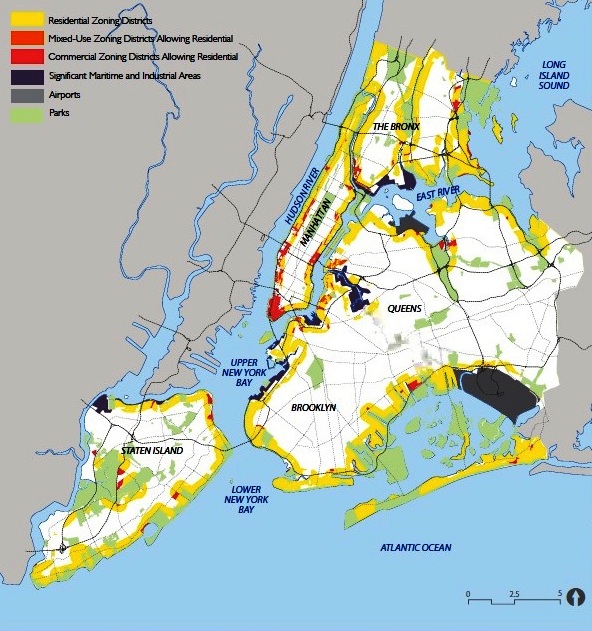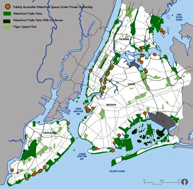 Đáng chú ý trong quy hoạch các khu chức năng ven bờ của New York, là trong khi một tỷ lệ lớn diện tích ven bờ dành cho chức năng ở, thì những nơi đó cũng là những khu vực bố trí giáp ranh các không gian xanh công cộng quan trọng ven bờ.