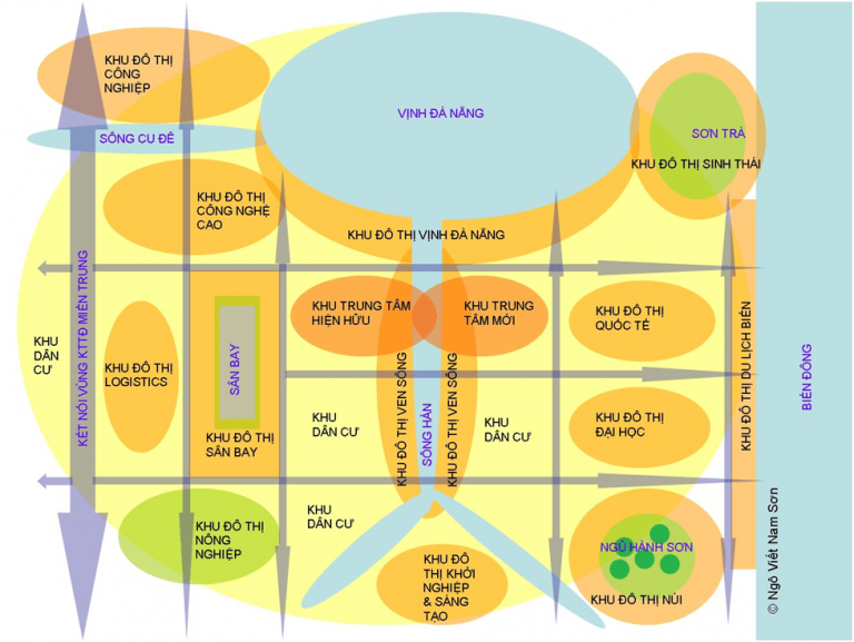 Việc tổ chức các không gian kinh tế xã hội đa dạng dọc theo các khu vực ven biển và ven sông là điều mà TP Đà Nẵng cần quan tâm khuyến khích trong thời gian tới. Chẳng hạn, Khu vực ven biển không chỉ có khu đô thị du lịch biển, mà còn có Khu Đô thị Công nghiệp kết hợp Cảng biển, Khu Đô thị Vịnh Đà Nẵng, Khu Đô thị Sinh thái, Khu Đô thị Công nghệ cao, Khu Đô thị Quốc tế, Khu Đô thị Đại học, Khu Đô thị Núi Ngũ Hành Sơn; Khu vực ven sông không chỉ có Khu Đô thị Ven sông, mà còn có Khu Trung tâm hiện hữu, Khu Trung tâm mới, Khu Đô thị Công nghệ cao, Khu Đô thị Khởi nghiệp & Sáng tạo,…