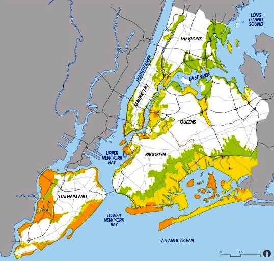 Tham khảo bản đồ dưới đây, chúng ta thấy TP New York cũng đã gặp vấn đề tương tự như Đà Nẵng, và đang có hướng giải quyết khá tốt, với việc phân ra các giải pháp khác nhau đối với khu đất sở hữu công và sở hữu tư nhân, sao cho người dân ở mọi khu vực ven biển đều có thể tìm được lối công cộng ra biển và các khu dịch vụ phục vụ cần thiết trong khoảng cách gần nhất từ khu dân cư của họ.
