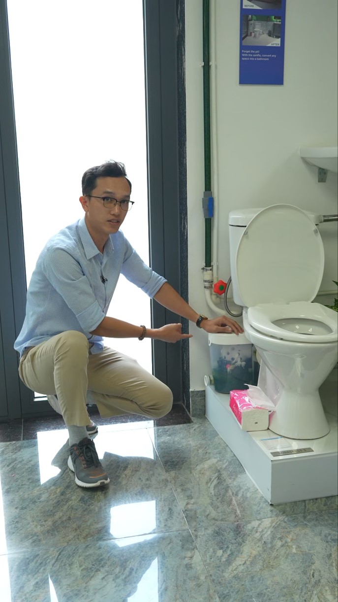Giải pháp được lựa chọn là hệ thống bơm nghiền xả thải Sanitoilet từ nhà sản xuất SFA (Pháp). Đây là thiết bị cho phép lắp đặt các thiết bị vệ sinh (bồn cầu, chậu rửa) ở bất kỳ vị trí nào mà không phụ thuộc vào đường ống thoát nước chính, thông qua cơ chế bơm đẩy chủ động.