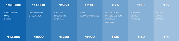 Khi quy mô càng lớn, cần đánh giá mức độ thể hiện và kích thước công việc cần trình bày. Tỉ lệ từ 1: 150 đến 1: 100 cũng có thể sử dụng cho các phương pháp tiếp cận đầu tiên của các tác phẩm và các công trình nhỏ. Trong trường hợp các tòa nhà lớn hơn, kiến trúc sư sẽ dự tính các bản vẽ và mô hình chi tiết hơn, bao gồm các yếu tố cấu trúc và bố cục được xác định rõ hơn.