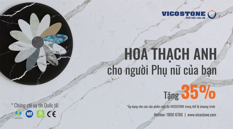 Nhân dịp chào mừng Ngày Quốc tế Phụ nữ 8/3, ngày tri ân những người phụ nữ dấu yêu, thương hiệu đá thạch anh VICOSTONE dành tặng Quý khách hàng chương trình khuyến mại hấp dẫn “Hoa Thạch Anh”, với ưu đãi chiết khấu trực tiếp 35%.