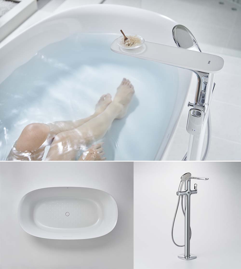 Phần vòi được thiết kế như một chiếc khay để bạn có thể đặt nến thơm hay muối tắm lên trên, thả mình tận hưởng những giây phút thư giãn trong bồn tắm.