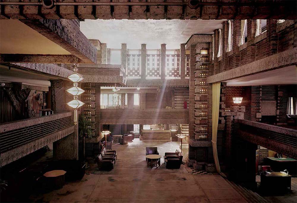 Bên trong khách sạn, các ô thoáng trang trí giúp tôn vinh vẻ đẹp ánh sáng và bóng tối của nội thất khi ánh sáng mặt trời chiếu vào từ giếng trời và cửa sổ. Trong gần nửa thế kỷ kể từ khi tòa nhà được đưa vào sử dụng, những tính toán tỉ mỉ của Wright khi tận dụng ánh sáng tự nhiên kết hợp với gạch ốp xước màu vàng, đá nham thạch Oya và đất nung được thiết kế tinh vi tạo nên những tia sáng huyền ảo, mang đến trải nghiệm thẩm mỹ độc đáo làm say đắm du khách.