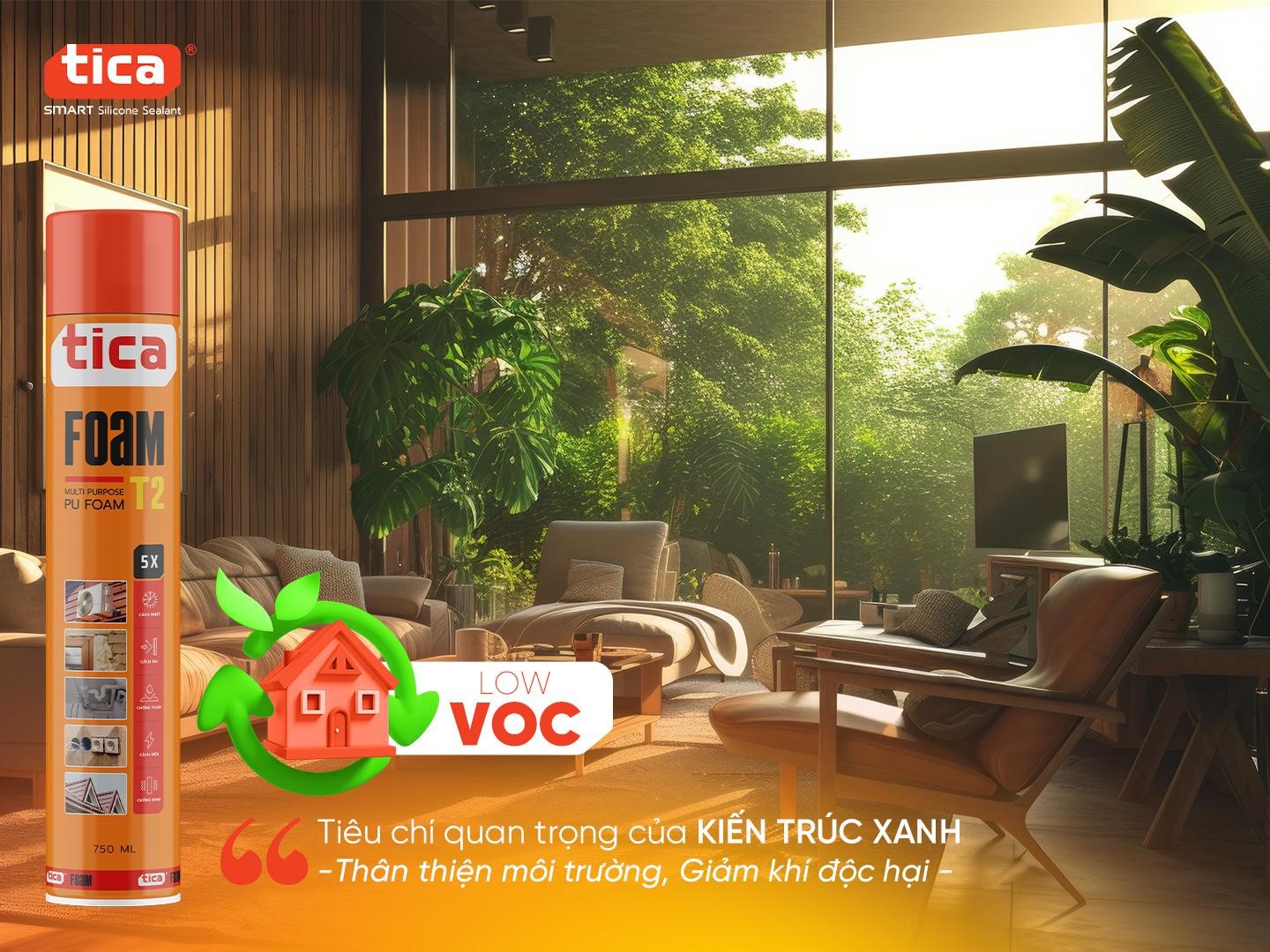 Keo bọt nở Tica PU FOAM T2 với chỉ số VOC thấp, nhẹ mùi, an toàn cho sức khỏe người thi công và không gây ảnh hưởng đến chất lượng không khí trong nhà. Đây là một trong những tiêu chí quan trọng của kiến trúc xanh, khi xu hướng sử dụng vật liệu thân thiện môi trường, giảm khí thải độc hại đang ngày càng được ưu tiên trong các công trình hiện đại. Việc lựa chọn Tica PU FOAM T2 không chỉ giúp thi công hiệu quả mà còn góp phần xây dựng không gian sống bền vững, an toàn hơn.
