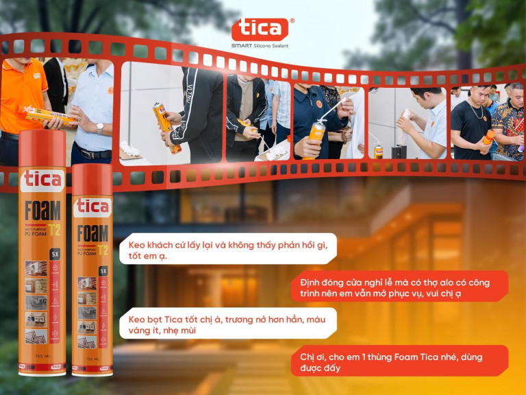 Hành trình nhật ký công trình Keo bọt nở TICA PU FOAM T2 tự hào và vui mừng khi sau 2 tháng sản phẩm chính thức ra thị trường đã nhận được những chia sẻ chân thành từ những anh thợ uy tín, lành nghề và chuyên nghiệp từ khắp mọi miền Tổ quốc: Vì sao họ lựa chọn Keo PU Foam T2? và sau 01 tháng sử dụng tại công trình chống thấm các khung cửa, hay thi công trên khe hở mái nhà, quá trình thi công, lắp đặt hoàn thiện kết hợp với Keo silicone Tica T500 – chuyên cho nhôm kính đều phản hồi tốt và được chứng minh bằng việc quay trở lại đại lý, cửa hàng và tiếp tục dùng Keo bọt nở Tica PU FOAM T2.