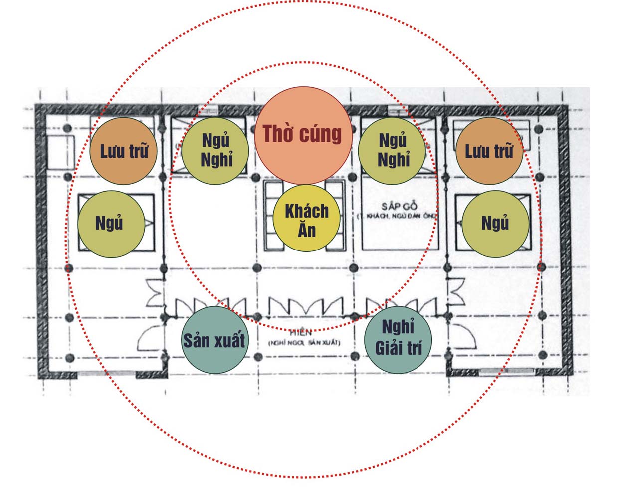 Chẳng hạn, không gian thờ cúng tổ tiên thay vì bố trí trong 1 phòng riêng biệt và đẩy lên cao như thường thấy tại nhà ở đô thị hiện nay thì nên được hòa nhập vào phòng khách/sinh hoạt chung theo lối truyền thống, vừa tạo ra cảm giác ấm cúng gần gũi lại vừa thuận tiện cho các hoạt động thờ cúng dù có thể hoạt động này không còn quá thường xuyên như trước đây.