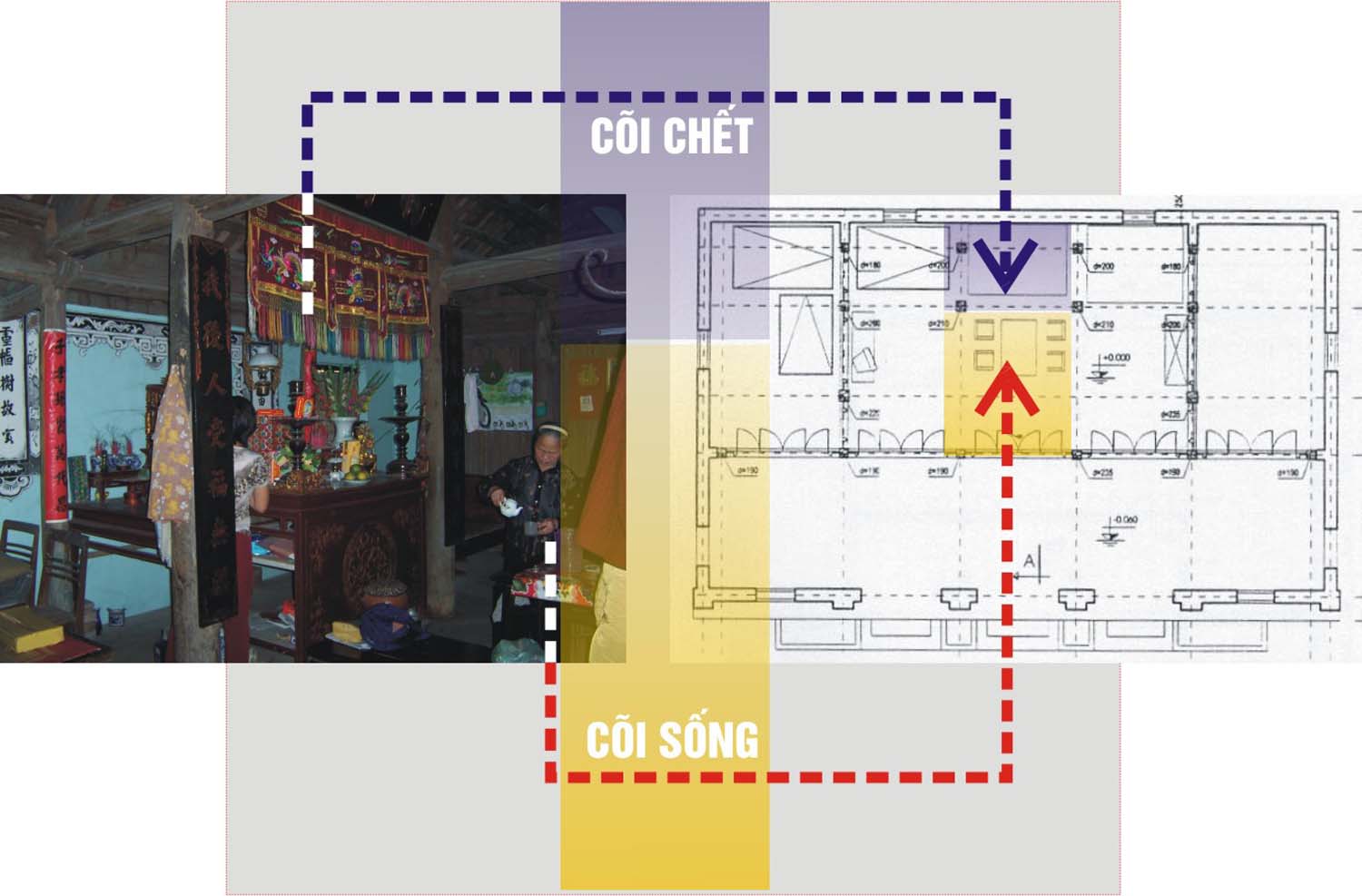 Không gian chính của ngôi nhà thường nằm ở vị trí trung tâm và có thể bao gồm 3 gian, 5 gian… liên tục được hòa vào nhau và không có sự ngăn cách về thị giác. Điểm nhấn chính của không gian này là ban thờ tổ tiên ở chính giữa, hai bên ban thờ thường bố trí giường/phản – nơi diễn ra các hoạt động sinh hoạt vào ban ngày và ngủ nghỉ của đàn ông vào ban đêm. Ban thờ chi phối các không gian còn lại và cả ứng xử của mọi người trong không gian chính, từ lời ăn tiếng nói đến tư thế ngồi, hướng nằm ngủ, và các hoạt động thường ngày khác… Chính trong không gian này ta có thể cảm nhận được sự giao hòa âm dương (tư tưởng xuất phát về bản chất của vũ trụ theo quan niệm của người Việt) bởi sự tồn tại của các cặp lưỡng phân và lưỡng hợp, trong đó điểm nhấn chính là cặp thiêng – tục, “cõi chết” – “cõi sống” với sự hòa nhập trọn vẹn của không gian dành cho người sống và không gian dành cho người đã khuất (Hình 2). Bằng cách đó, người ta tin rằng thế giới bên kia không quá xa xôi và ông bà tổ tiên có thể thường xuyên trở về phù hộ cho con cháu. Đây cũng là không gian mang tính hướng ngoại nhất của ngôi nhà, là nơi để những gia đình giàu có thể hiện đẳng cấp và vị thế xã hội của mình.