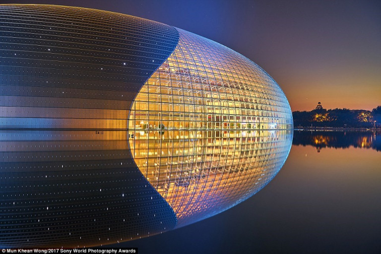 Tòa nhà Trung tâm Nghệ thuật Biểu diễn Quốc gia (Bắc Kinh, Trung Quốc) soi bóng xuống nước trong buổi hoàng hôn.