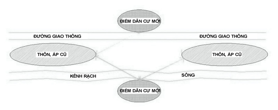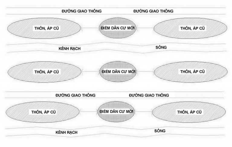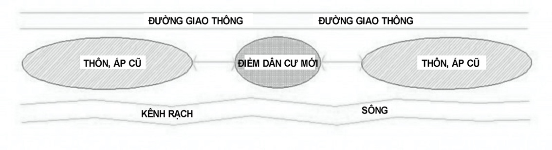 - ĐDCNT có tổ hợp cấu trúc dạng tuyến tính: Kết nối một hoặc hai thôn, ấp cũ theo tuyến bằng cách tận dụng hệ thống giao thông đường bộ và ven kênh rạch, ven sông. Ưu điểm: Tiết kiệm kinh phí đầu tư cho hệ thống giao thông; phù hợp với điều kiện địa hình và văn hóa, lối sống, phong tục tập quán của cư dân quen sống vùng kênh rạch và đi lại chủ yếu bằng ghe, thuyền.