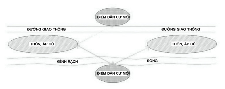 - ĐDCNT có tổ hợp cấu trúc dạng Nhóm: Kết nối hai hay ba thôn, ấp cũ tạo nên một tổ hợp nhóm, do yếu tố địa hình nhiều kênh rạch nên sử dụng cầu bắc qua, kết hợp với đi lại bằng ghe, thuyền.
