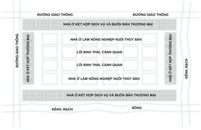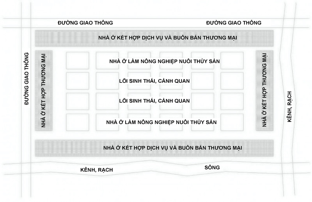 - ĐDCNT có tổ hợp cấu trúc dạng điểm: Dựa trên hệ thống kênh, rạch xung quanh và trung tâm bố trí lõi sinh thái. Các công trình nhà ở kết hợp với làm dịch vụ, thương mại bố trí vòng ngoài ĐDCNT bám theo trục đường giao thông và kênh, rạch. Lõi sinh thái ở trung tâm kết hợp với nhà trẻ, trường học, nhà văn hóa, cây xanh, mặt nước, hồ điều hòa, hồ chứa nước ngọt, đồng thời làm mô hình nhà ở nông nghiệp nuôi trồng thủy sản theo hệ sinh thái khép kín. Mô hình này cũng phù hợp với các khu dân cư có số dân nhỏ.