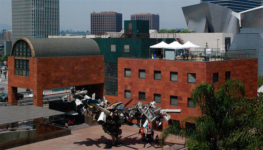Dự án đầu tiên của Isozaki tại nước ngoài là Bảo tàng Nghệ thuật Đương đại Los Angeles. Ở dự án này, khách hàng muốn thành lập một tổ chức nghệ thuật trái ngược với NY L Moma. Việc lựa chọn KTS cho dự án cũng khá ngặt nghèo, hơn 50 KTS quốc tế được chọn vào danh sách tham gia. Trong quá trình tuyển chọn, chủ đầu tư đã đến thăm các dự án đã được xây dựng của các KTS này.