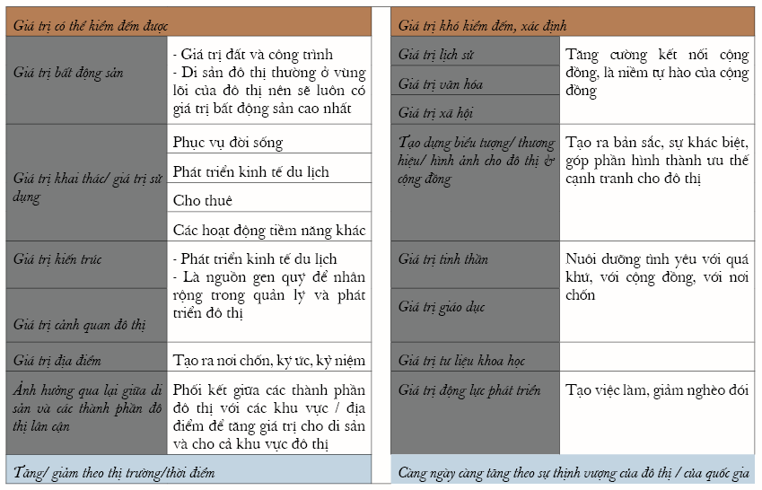 Giá trị di sản tổng hợp các yếu tố hữu hình và vô hình. Trong khi yếu tố hữu hình có thể dễ dàng kiểm đếm, đo lường và dễ đạt được sự đồng thuận về giá trị thì yếu tố vô hình khó khăn hơn, trong nhiều trường hợp không xác định chính xác được. Đánh giá giá trị một di sản/ cụm di sản đô thị đôi khi yêu cầu chúng ta phải phân tích và đánh giá cả các thành phần đô thị có liên quan, bởi di sản đô thị, cũng như các thành phần đô thị khác, luôn có các quan hệ phụ thuộc, ràng buộc và quan hệ tác động (xem bảng 1).