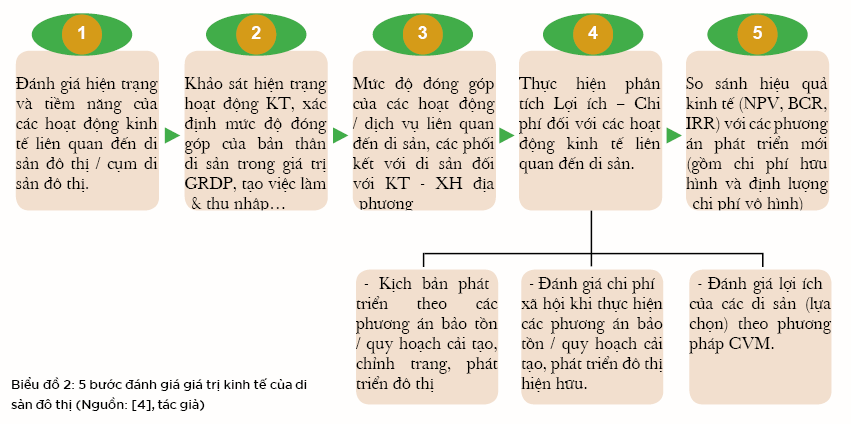 Bên cạnh việc chứng minh tính quan trọng của di sản đô thị về mặt lịch sử, văn hóa, giáo dục… thì cần thiết phải nghiên cứu, đánh giá, lượng hóa giá trị kinh tế của di sản đô thị (cả giá trị hữu hình và vô hình trong một chu kỳ quá khứ – hiện tại – tương lai) để có thể cung cấp cho các nhà quản lý/ nhà đầu tư/ cộng đồng các số liệu đầy đủ về ảnh hưởng của việc giữ hay không giữ di sản. Để đánh giá và lượng hóa đúng hơn hệ giá trị kinh tế của di sản đô thị, chúng tôi đề xuất 5 bước thực hiện sau: