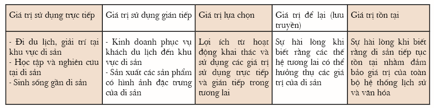 Nghiên cứu của Wright và Eppink [13] công bố năm 2016 cho thấy: Theo các giá trị nêu trên, giá trị du lịch, lựa chọn, tồn tại và lưu truyền là những giá trị được đánh giá cao.