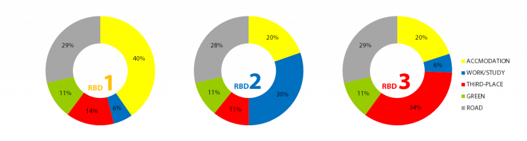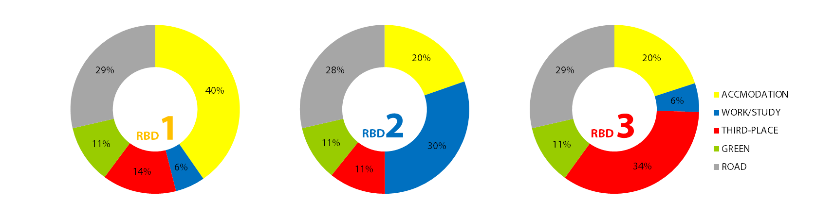 Trên mỗi tuyến, mật độ tập trung cao nhất ở khu vực trung tâm đô thị hiện hữu, thường thiên về phía các đơn vị PKGĐS có nơi chốn chủ đạo là nơi chốn thứ ba. Tuy nhiên, mật độ tập trung cao này không thuần túy theo dạng hình parabol một chiều mà có khuynh hướng hình sin với các đỉnh ở ga và khu vực giữa hai ga có cự ly gần (dưới 1.000m)