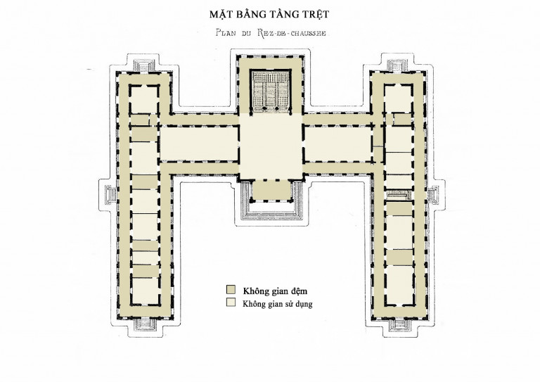 Tính thích ứng với khí hậu thể hiện rõ nét qua các không gian đệm trong công trình. Bao quanh công trình là hệ thống hành lang tạo không gian đệm, giảm ánh nắng, mưa hắt trực tiếp vào phòng. Giữa các phòng làm việc đều có phòng đệm và hai lớp cửa đi. Tầng hầm có tác dụng cách ẩm, cách nhiệt, thích nghi với khí hậu bản địa. Khu vệ sinh và nút thang ở hướng xấu Đông-Tây.