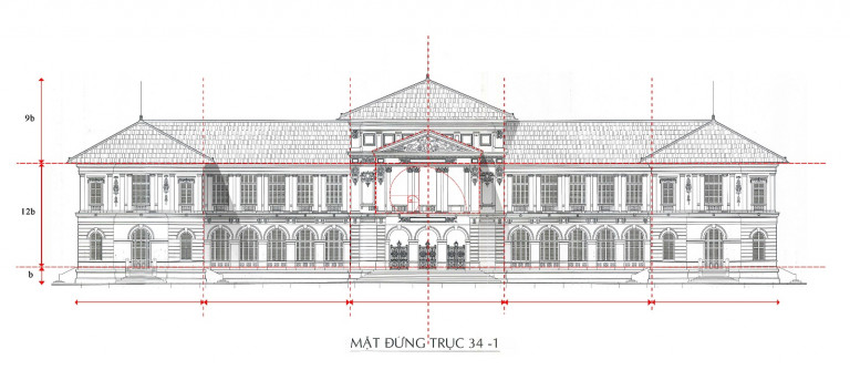 Các quy luật của kiến trúc cổ điển đặt áp dụng trên mặt đứng: Đối xứng tuyệt đối thể hiện sự uy nghiêm của tòa án. Mặt đứng chính chia thành 5 đoạn (còn gọi là ngũ đoạn luật), trong đó nhấn mạnh khối trung tâm, hai khối đầu hồi nhô ra tương ứng các diện đặc-rỗng-đặc-rỗng-đặc. Phương vị ngang áp dụng nguyên tắc dưới nặng, trên nhẹ: Tầng trệt nặng, đặc ứng với kết cấu cuốn vòm, tầng lầu nhẹ, rỗng với thức cột đỡ mái, lan can dưới cửa. Các bộ phận đều theo tỷ lệ bán kính đáy cột rất chuẩn xác, đạt tính thẩm mỹ cao.